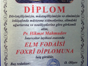 Alim Dövlətçiliyimizin, müstəqilliyimizin və elmimizin inkişafında müs¬təs¬na xidmət¬lərinə, elimdəki uğurlarına və nailiyətlərinə görə “İnterxəbər layihəsi” əsasında “Elm fədaisi” fəxri diplomuna da layiq görülüb.