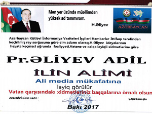 AMEA Geologiya və Geofizika İnstitutunun Palçıq vulkanizmi şöbəsinin rəhbəri, geologiya-mineralogiya elmləri doktoru, professor Adil Əliyev Azərbaycan Kütləvi İnformasiya Vasitələri İşçiləri Həmkarlar İttifaqının tərəfindən keçirilmiş rəy sorğusuna görə elm adamı olaraq, ulu öndər Heydər Əliyevin ideyalarının həyata keçirilməsi uğrunda fəaliyyəti, Vətənə və xalqa layiqli xidmətlərinə görə “İlin alimi” ali media mükafatına layiq görülüb.