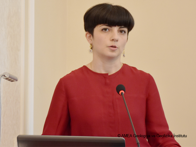 Sonra iddiaçı Aytən Hüseynova «Изотопная геохимия флюидов грязевых вулканов Шамахы-Гобустанского и Нижнекуринского районов в связи с оценкой перспектив нефтегазоносности» mövzusunda dissertasiya işinin xülasəsi ilə iştirkçıları tanış edib. Bildirib ki, Şamaxı-Qobustan və Aşağı Kür rayonlarının palçıq vulkalarının izotop - geokimyəvi parametrlərinin və kompleks məlumatlara əsasən flüidlərin əmələgəlmə şəraitlərinin dəyişiklik müntəzəmliyinin aşkar edilib.Təqdiqat rayonu ərazisində palçıq vulkanları flüidlərinin palçıq vulkanlarının yerləşməsi, stratiqrafik intervallara bağlılığı, kompleks geokimyəvi xassələri və flüidlərin formalaşma temperaturu kimi müxtəlif göstəricilərinin alınması, təhlili və müqayisəsi əsasında dayazda olan karbohidrogen potensialının yenidən qiyətləndirilməsi əsaslandırılıb.